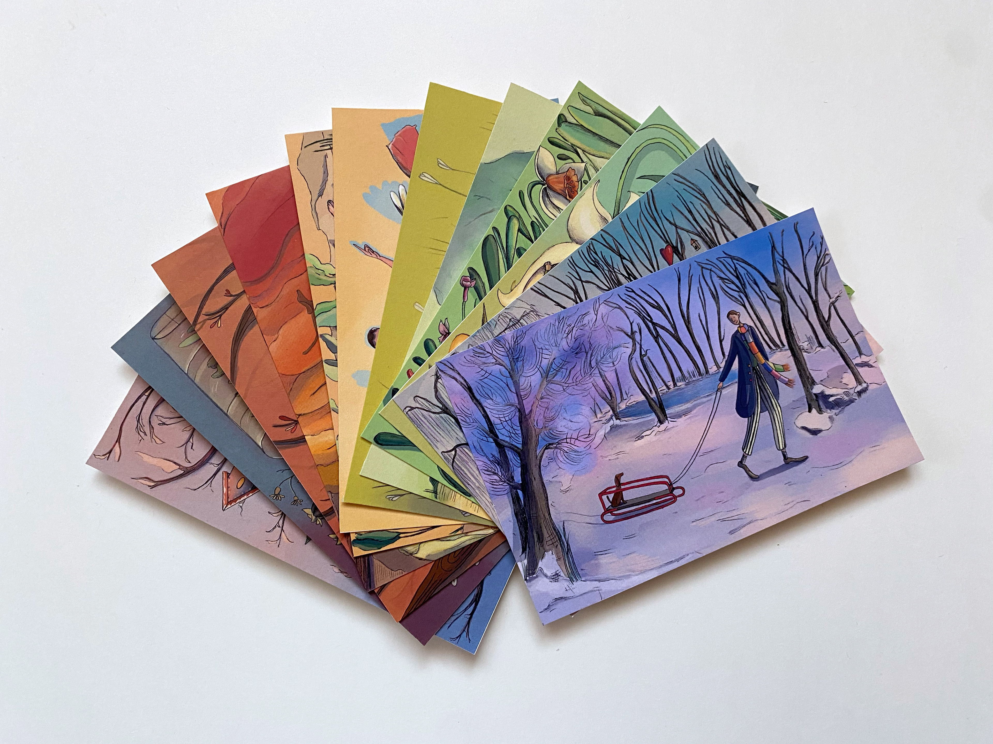A set of 12 seasonally themed postcards for each month of the year.
